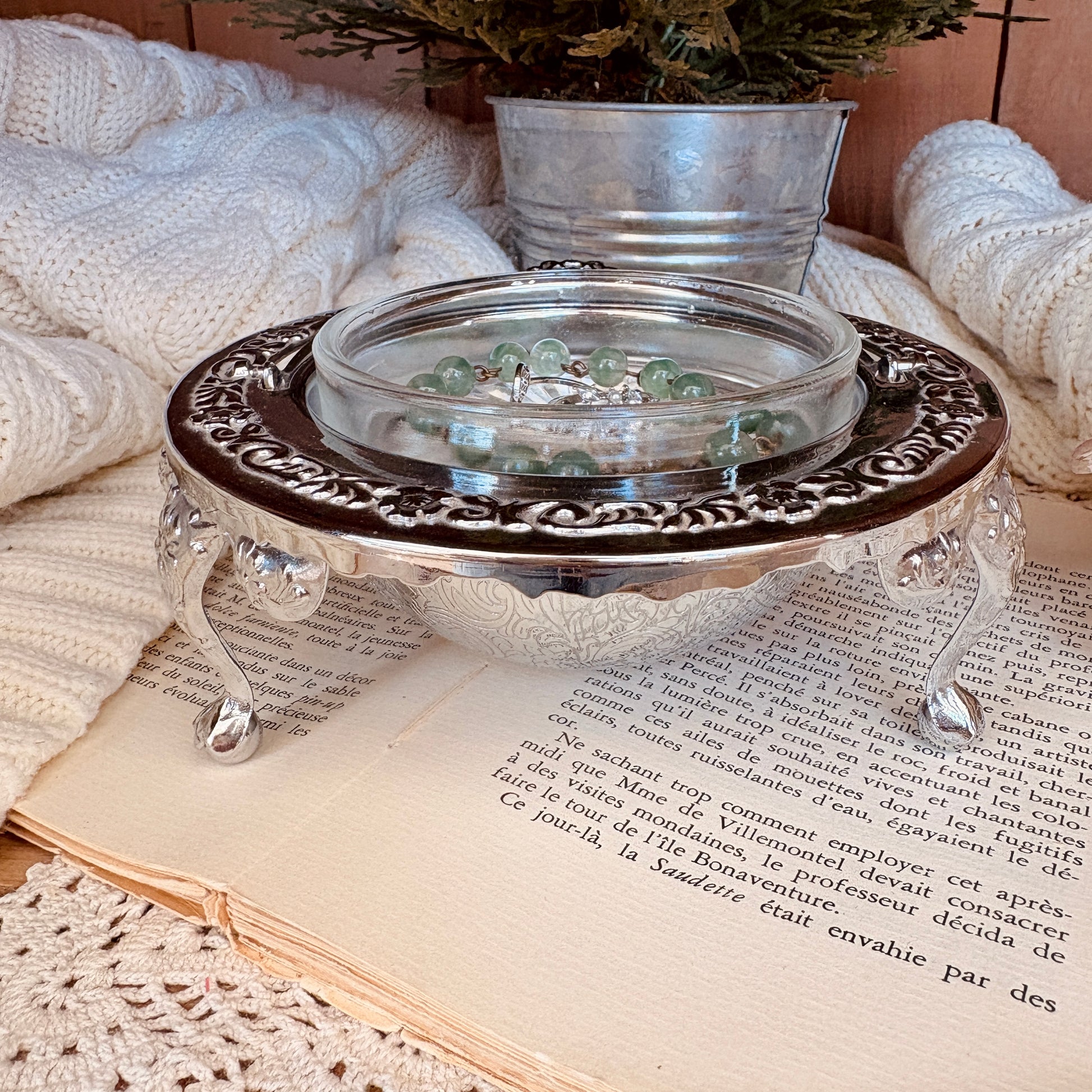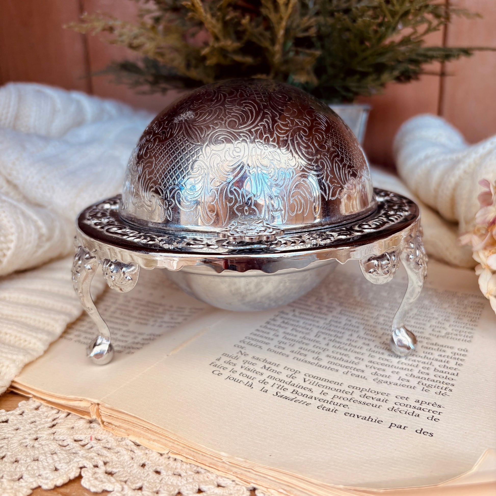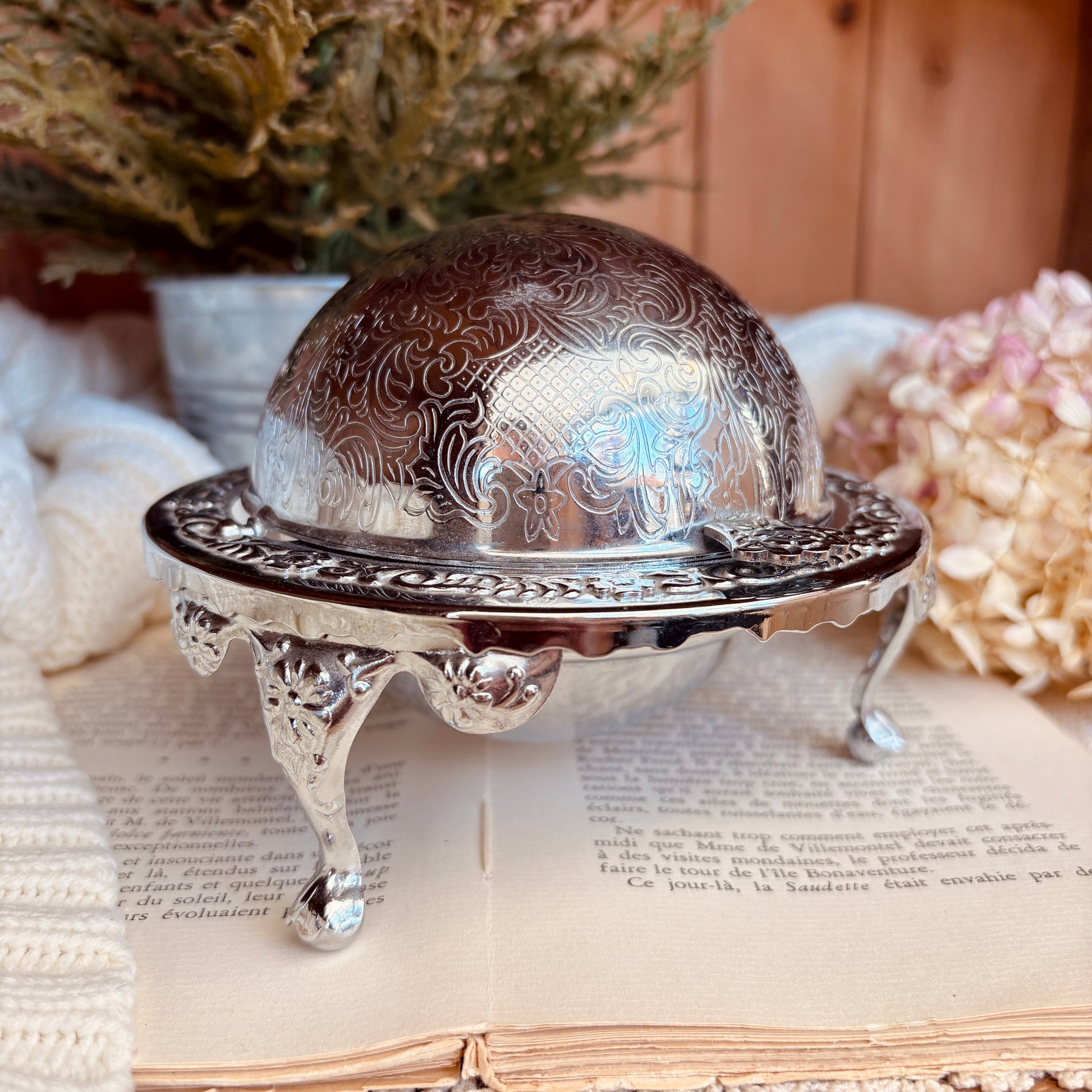 Beurrier Queen Anne d'époque, élégamment façonné sur pattes et plaqué argent. Cet objet anglais raffiné transcende sa vocation première pour devenir un accessoire polyvalent : rangement délicat pour bijoux précieux, écrin pour caviar ou service à beurre traditionnel. Son design intemporel et sa finition argentée en font une pièce de caractère qui ajoute une touche d'élégance discrète à tout intérieur.