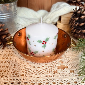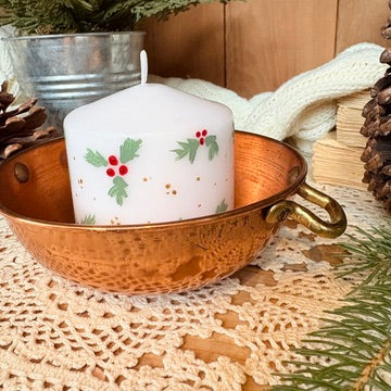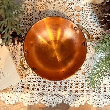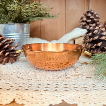 Petit bol en cuivre aux finitions élégantes, orné de poignées en laiton travaillé. Cet accessoire intemporel ajoute une touche de raffinement à votre décoration festive. Son design épuré et sa patine chaleureuse en font une pièce de choix pour les tables de fête ou simplement pour sublimer votre intérieur. Un détail sophistiqué qui capture la lumière et crée une ambiance festive authentique.