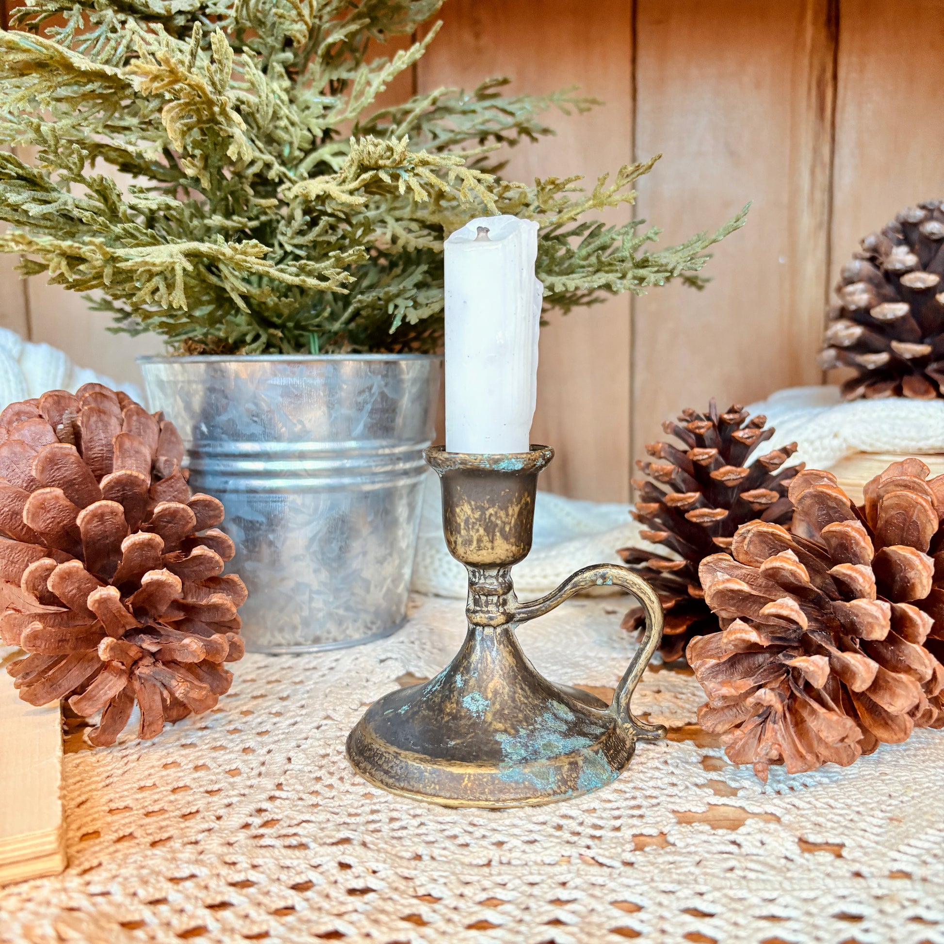 Bougeoir en laiton fabriqué en Italie, cette pièce arbore une patine authentique et un vert-de-gris naturel qui lui confère une élégance intemporelle. Son caractère antique ajoute une dimension poétique à votre décor festif, créant une ambiance chaleureuse et raffinée. Parfait pour illuminer vos moments de convivialité avec une touche d'histoire et de sophistication.