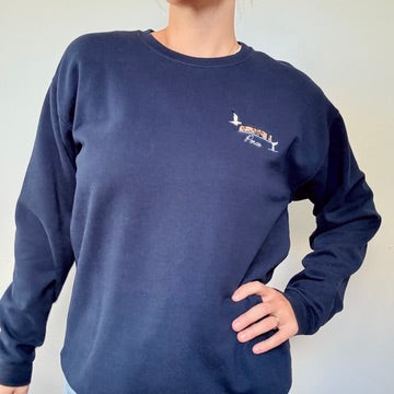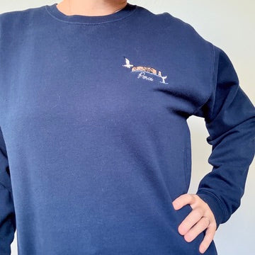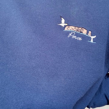 Discover the timeless comfort of classic navy cotton sweatshirt adorned with delicate Percé embroidery, evoking the salty freshness of the Gaspé Peninsula. Perfect for wrapping yourself in cozy softness while wearing a piece of Quebec nature, this garment combines simplicity and elegance for your casual days.