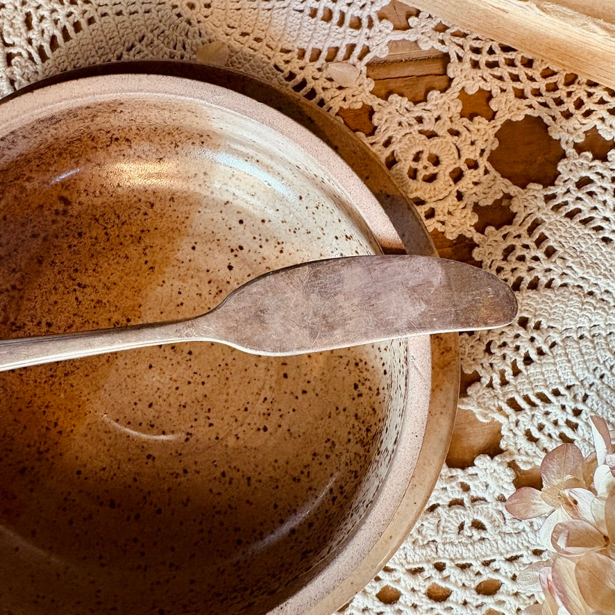 This silver butter knife is distinguished by its magnificent patina, giving it a timeless elegance. Perfect for enhancing your table settings, it combines refinement and functionality, offering a comfortable grip and a sharp edge for delicately spreading butter. A sophisticated choice to enhance your table setting.