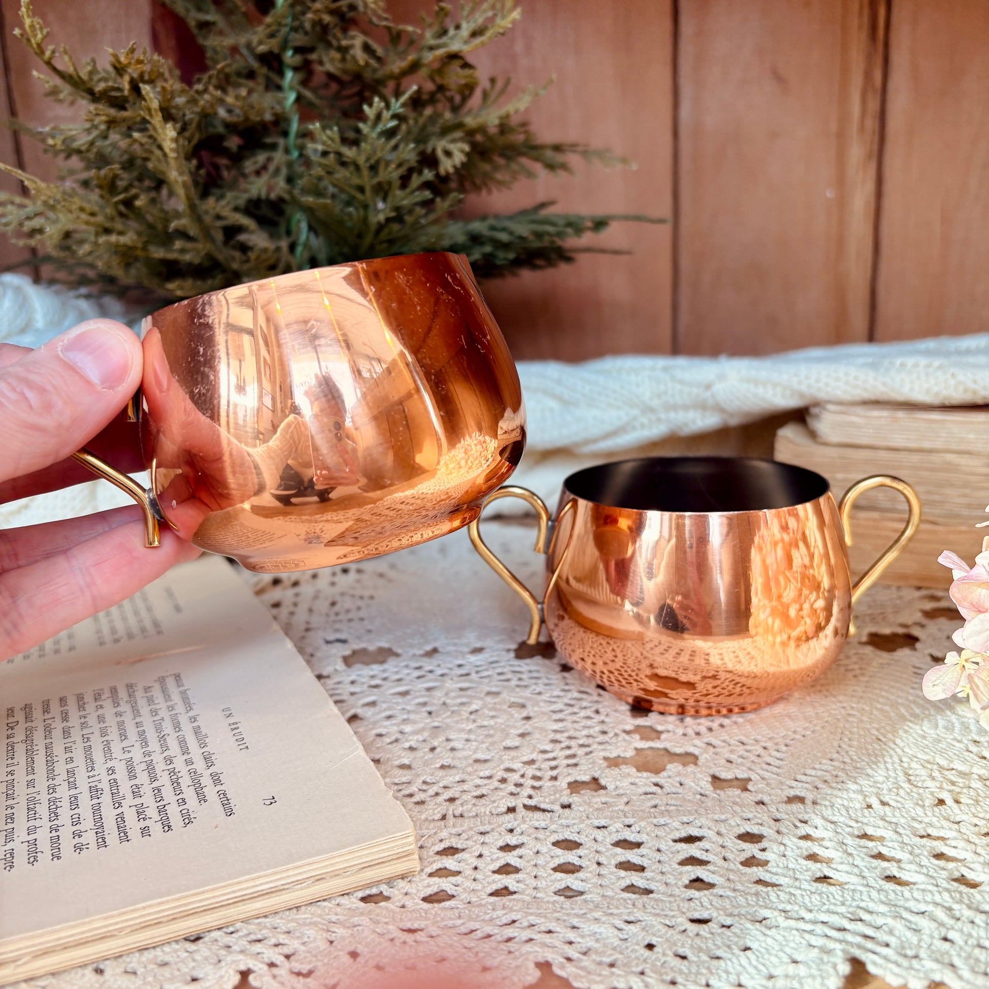 Ensemble à café en cuivre Rehaussez votre rituel du thé ou du café avec cet ensemble raffiné composé d'un sucrier et d'un crémier en cuivre. Chaque pièce allie l'élégance intemporelle du cuivre à une finition soignée, créant une présentation sophistiquée à votre table. Parfait pour les moments de détente en famille ou pour impressionner vos invités, cet ensemble 2 morceaux ajoute une touche de distinction à votre service à café. Un choix idéal pour les amateurs de belles choses qui apprécient l'authenticité et le style.