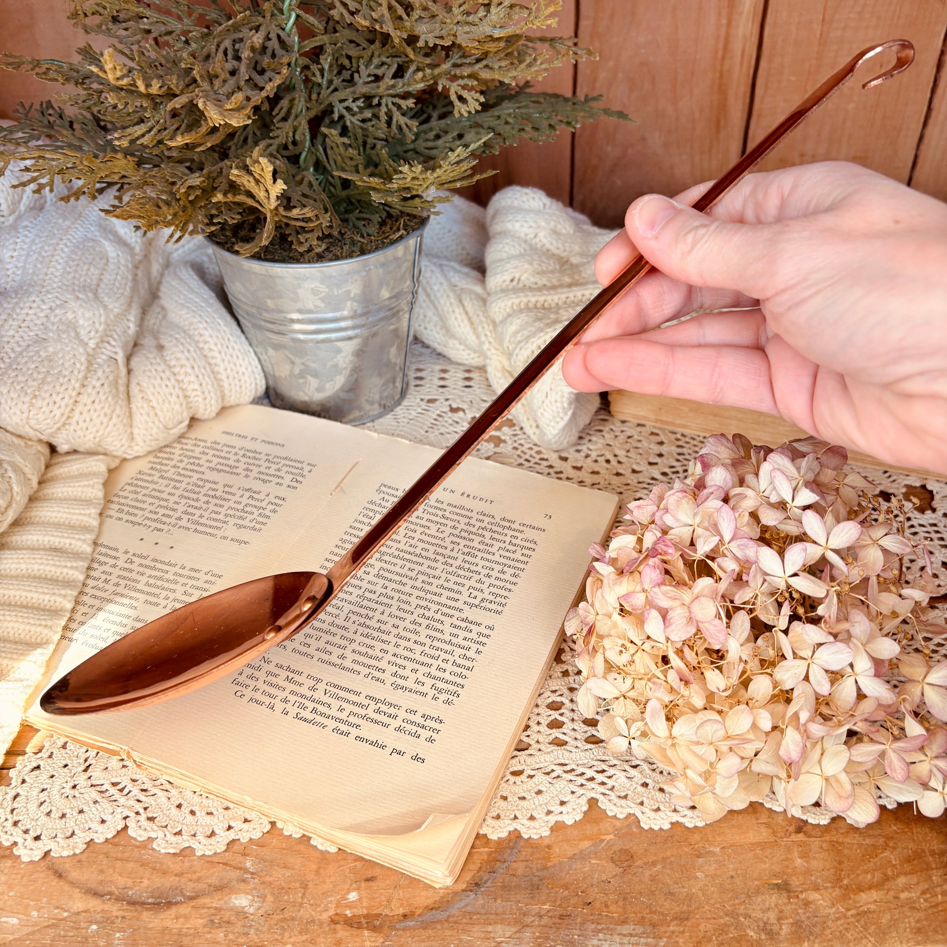 Grande cuillère en cuivre, alliant fonctionnalité et élégance intemporelle. Son design épuré met en valeur la patine naturelle du métal, tandis que le crochet de suspension intégré permet un rangement discret ou une présentation murale. Idéale pour les cuisines raffinées, elle ajoute une touche d'authenticité à vos ustensiles de cuisine quotidiens.