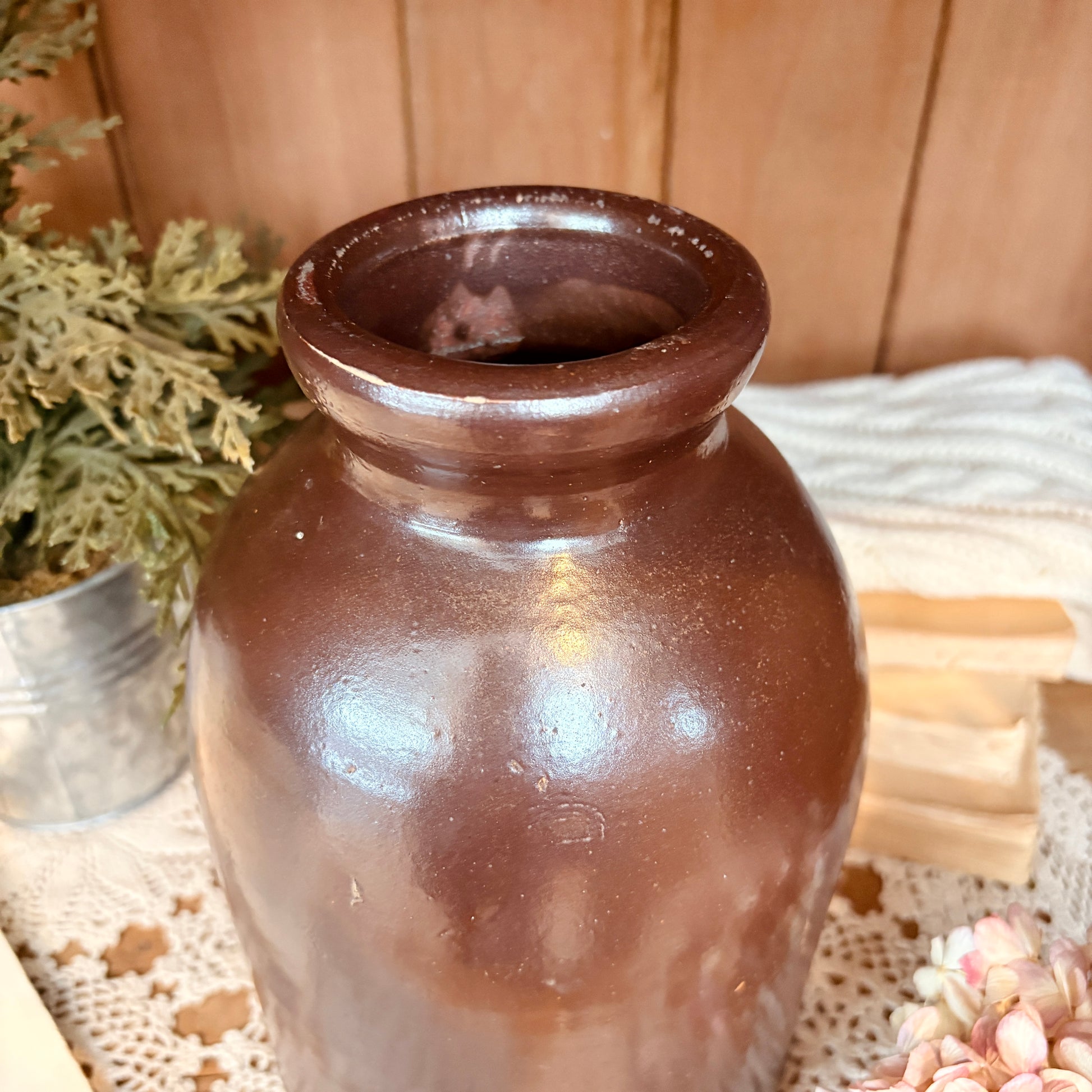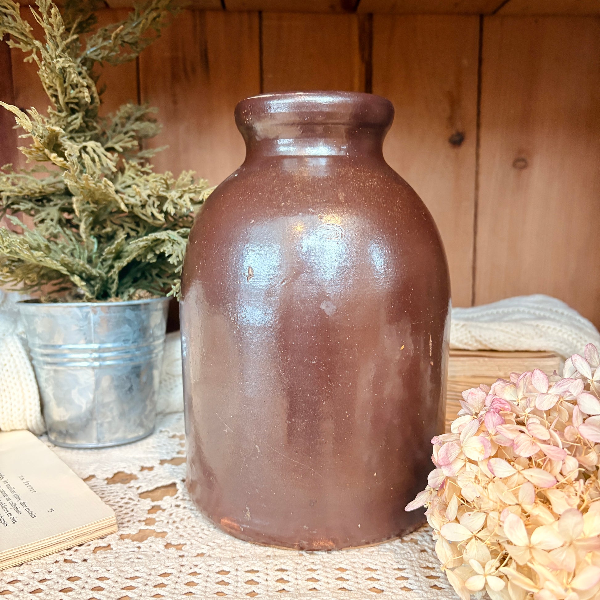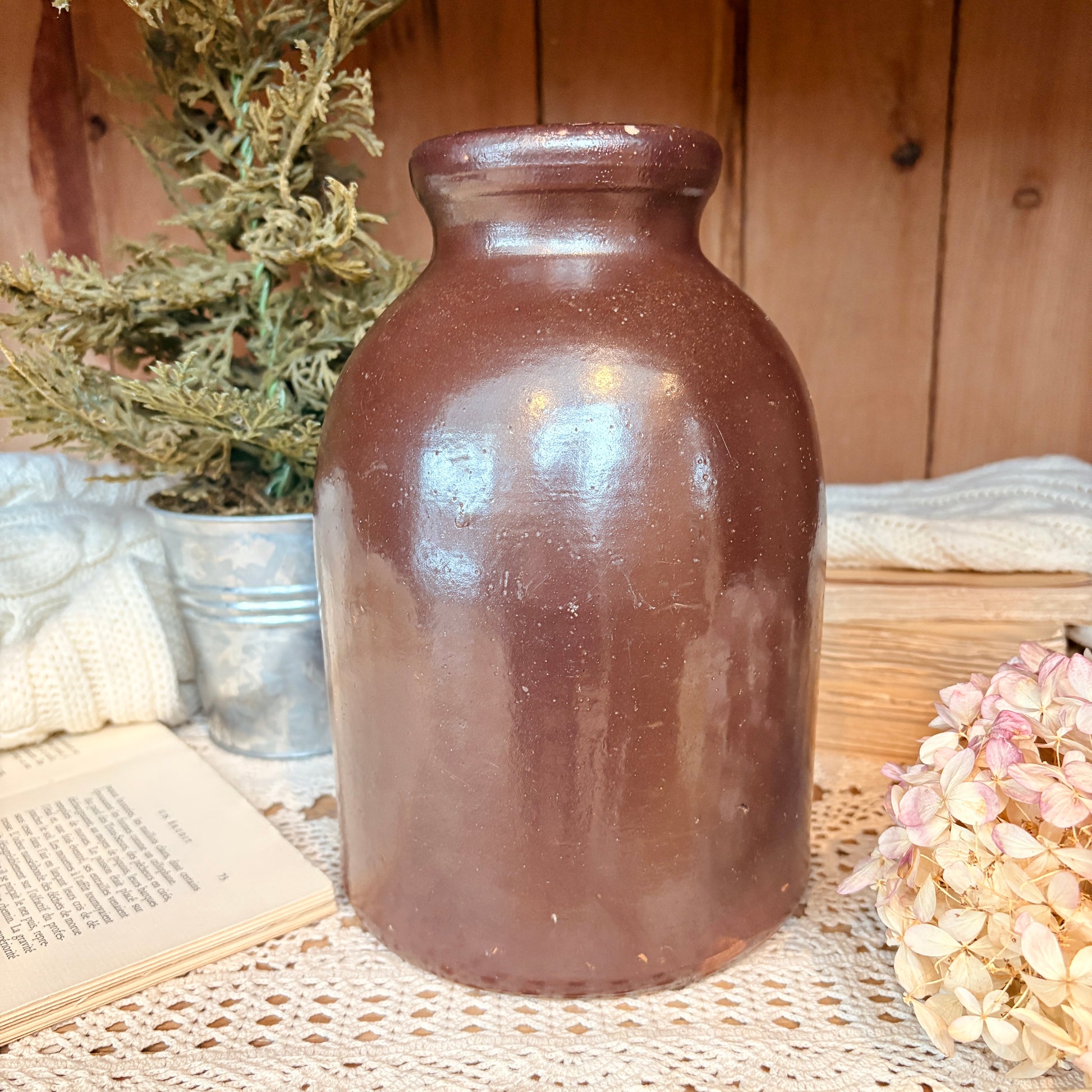 Jarre vintage aux teintes chocolat profond, cette pièce antique incarne l'élégance intemporelle. Son design raffiné en fait un vase à fleurs exceptionnel, capable de transformer n'importe quel arrangement floral en composition d'art. Parfaite pour les intérieurs classiques ou contemporains, elle ajoute une touche de sophistication et de caractère à votre décoration. Une acquisition pour les collectionneurs et amateurs de pièces authentiques.