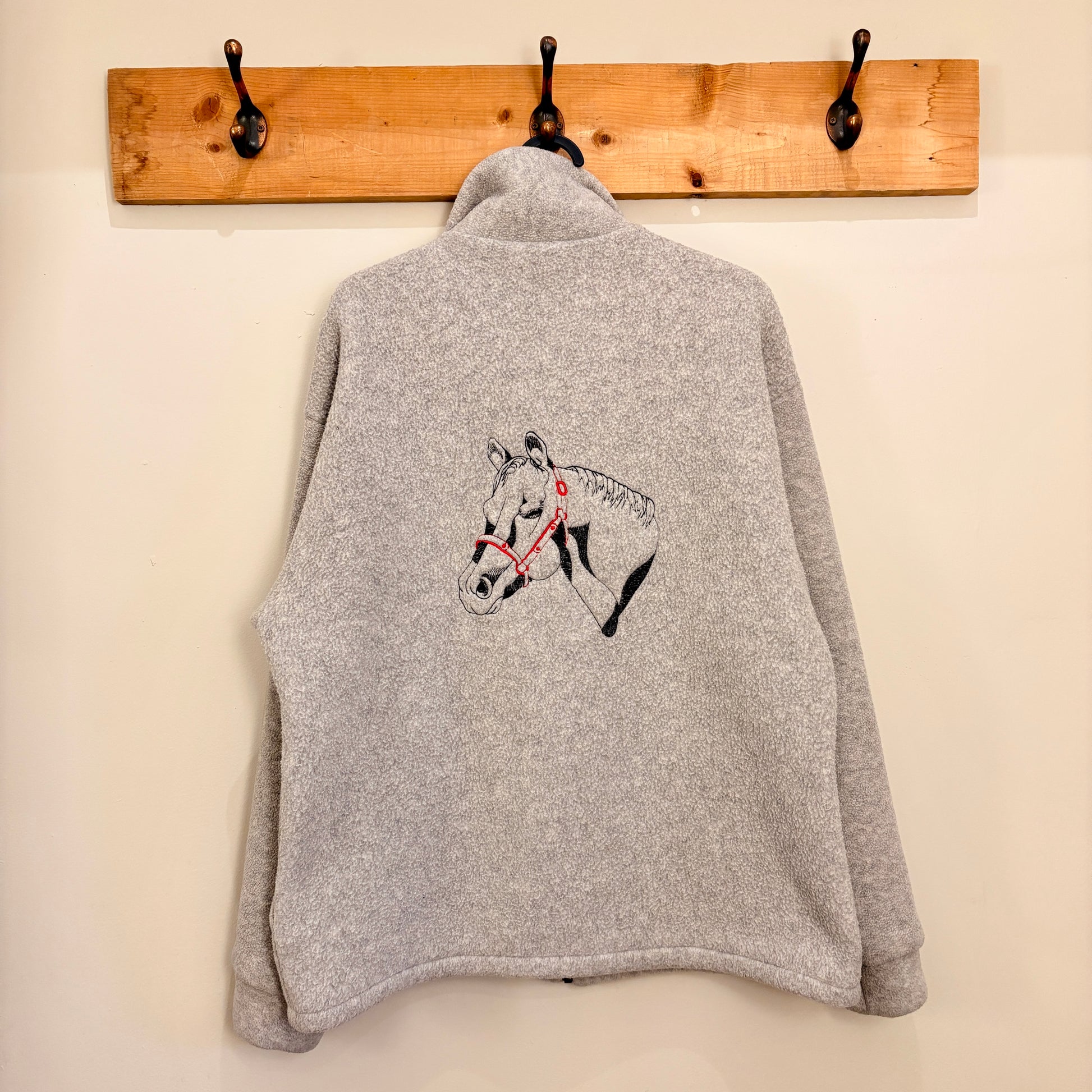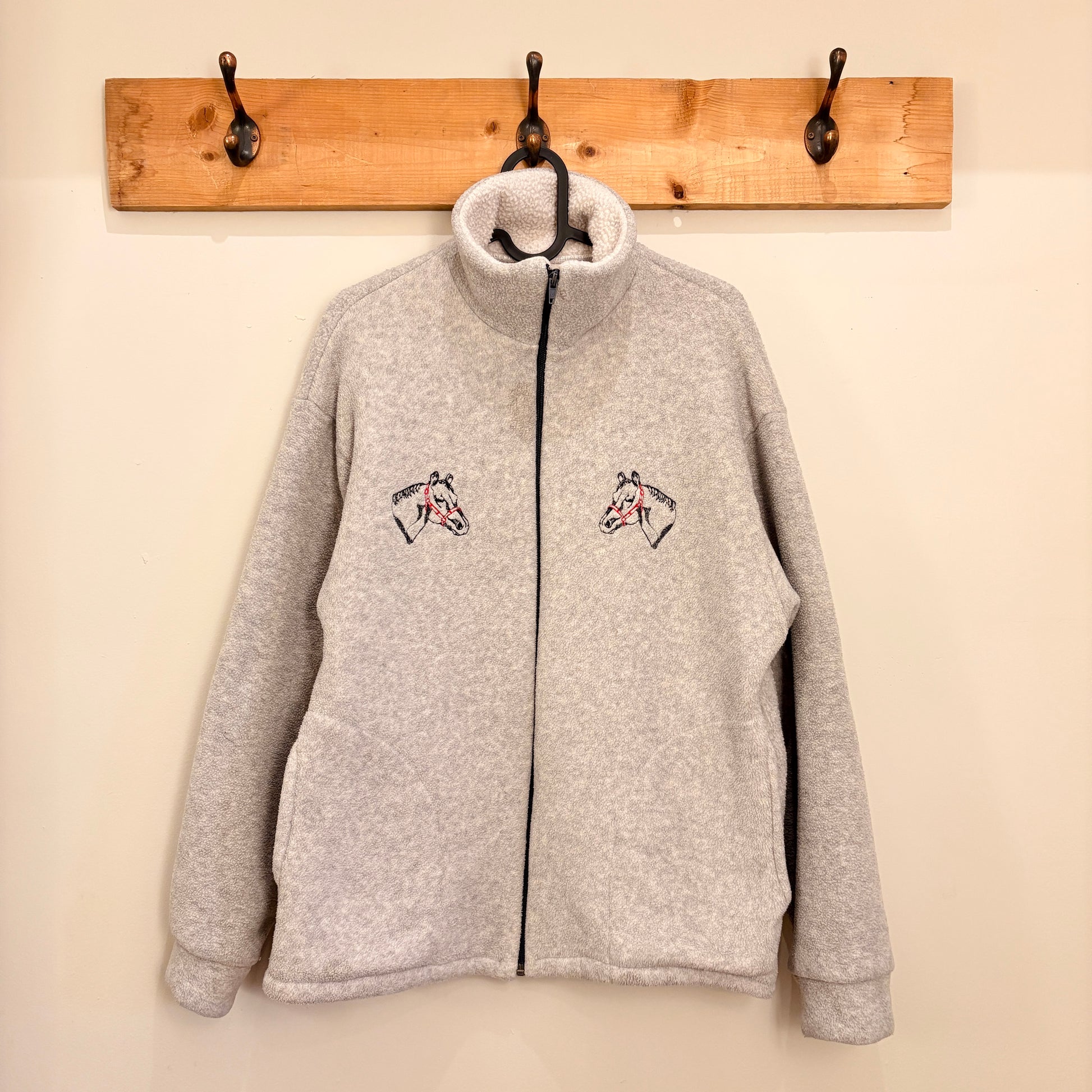 Polar gris élégant orné d'une broderie de chevaux détaillée. Ce vêtement extérieur parfait pour la saison printanière offre confort et style. Fabriqué au Canada avec soin, il combine chaleur légère et design sophistiqué pour vos aventures de printemps.