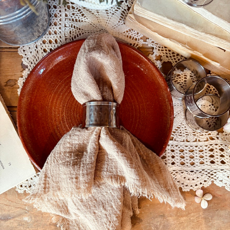 Bring a touch of understated elegance to your table with this set of 6 hammered silver napkin rings. Their textured finish subtly reflects the light, adding a sophisticated touch to every meal. Perfect for enhancing your dinner parties, they combine aesthetics and functionality with simplicity.