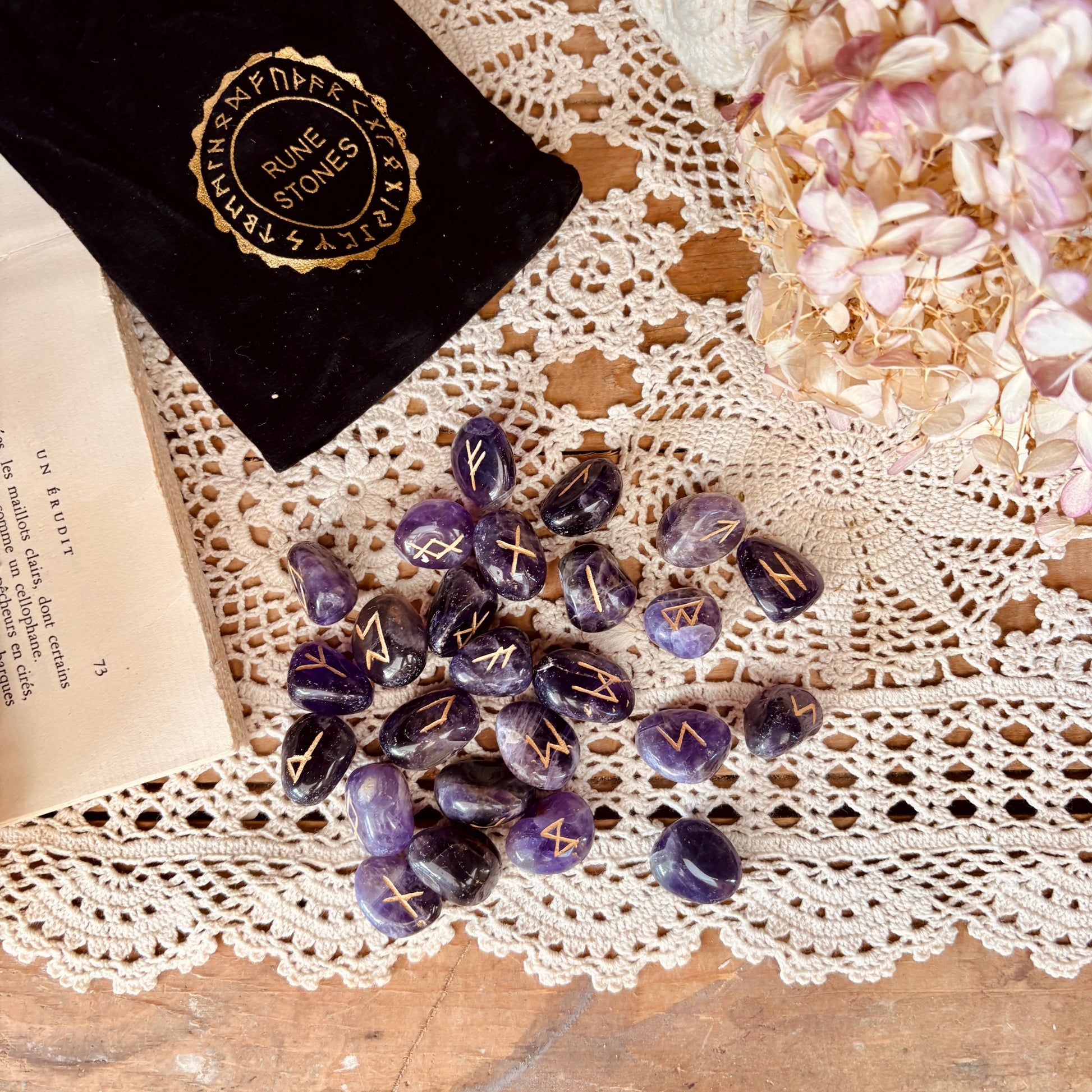 Découvrez cet ensemble complet de 25 runes divinatoires taillées dans de l'améthyste, une pierre réputée pour ses propriétés apaisantes et spirituelles. Chaque rune est finement travaillée et accompagnée d'une pochette de rangement élégante en tissu pour un transport facile et une protection optimale. Le livret de significations détaillé inclus vous guide à travers l'interprétation de chaque symbole, idéal pour les débutants comme pour les praticiens expérimentés. Parfait pour la divination, la méditation ou comme cadeau spirituel unique.