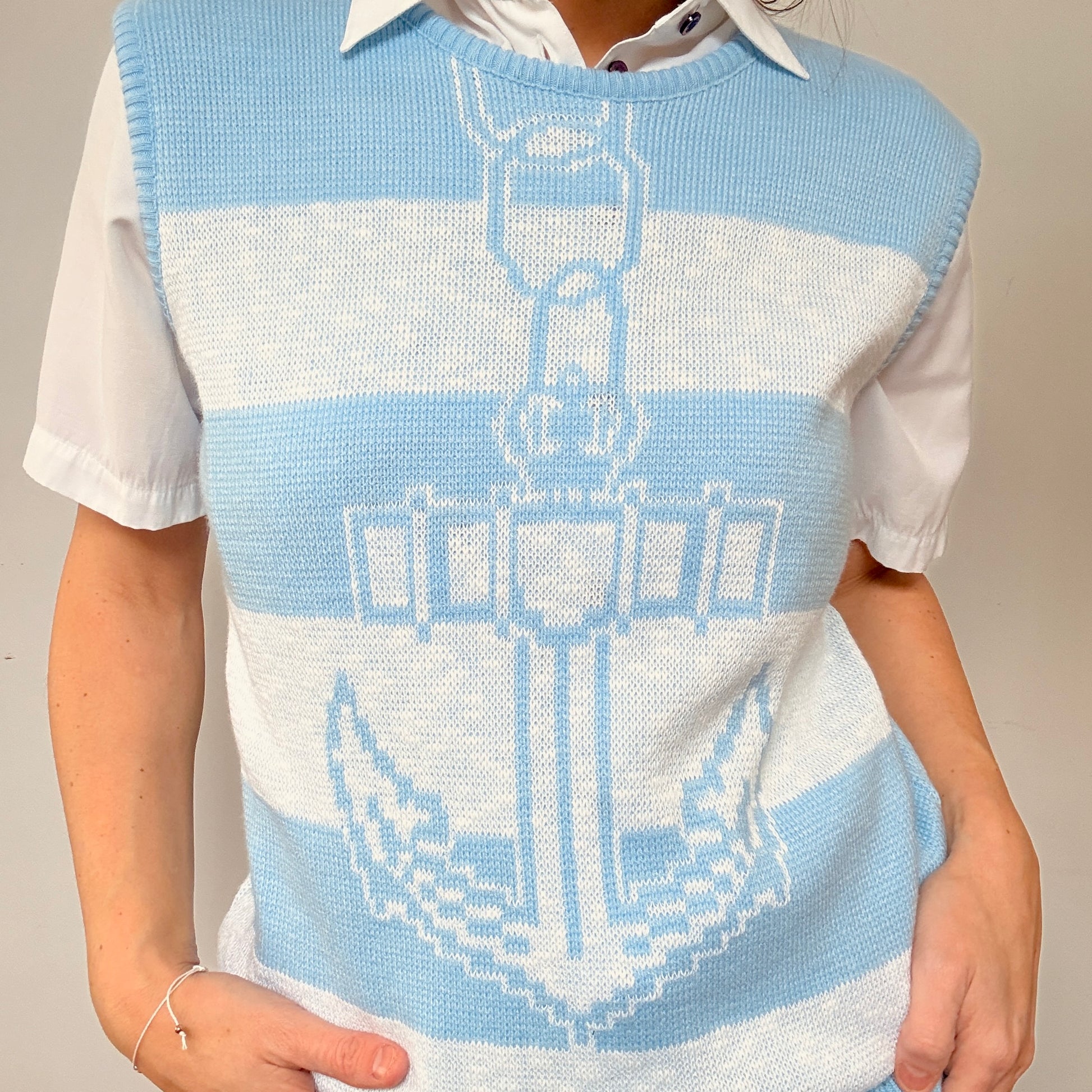 Débardeur bleu poudre aux rayures blanches classiques fabriqué au Canada, orné d'un motif d'ancre intemporel. Cette pièce nautique allie élégance côtière et confort quotidien. Parfait pour créer des looks décontractés avec une touche de raffinement maritime, il se marie aisément avec vos pièces essentielles de garde-robe.