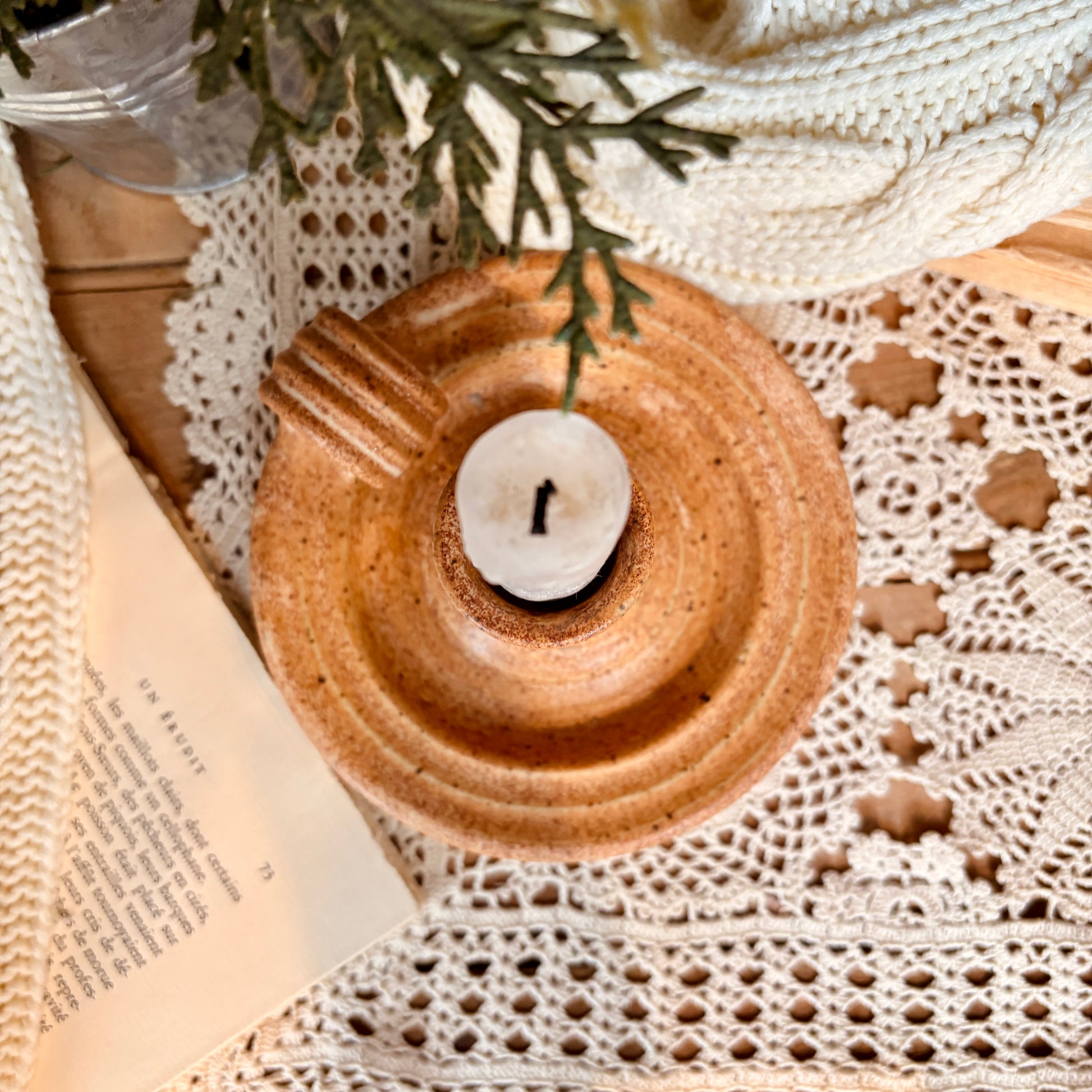Transformez n'importe quel espace en un sanctuaire chaleureux avec ce bougeoir en grès artisanal. L'anse pratique et l'assiette anti-dégât vous permettent de profiter de la lumière et de l'ambiance sans souci. Ajoutez une touche artisanale à votre décoration et laissez-vous bercer par la douce lueur des bougies.