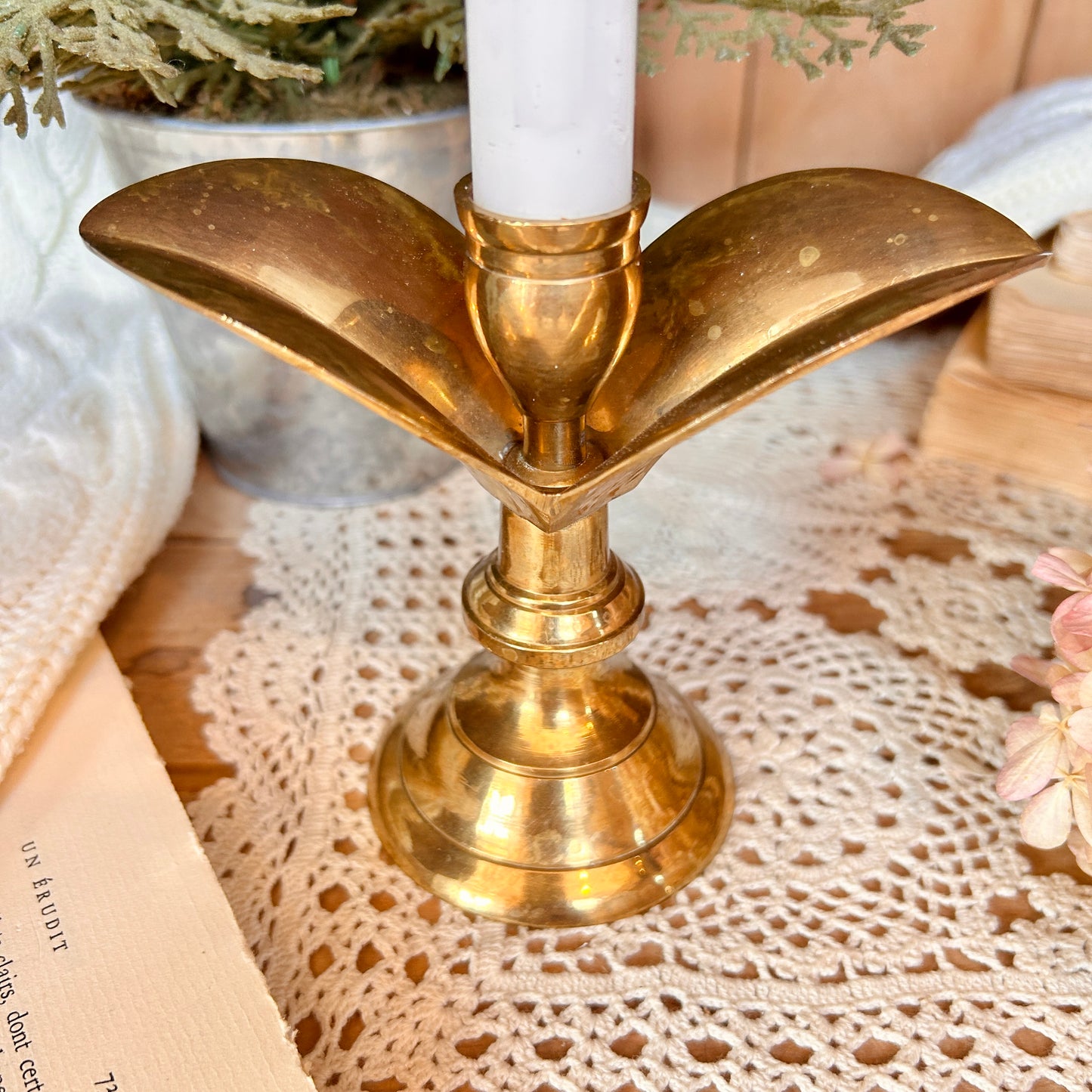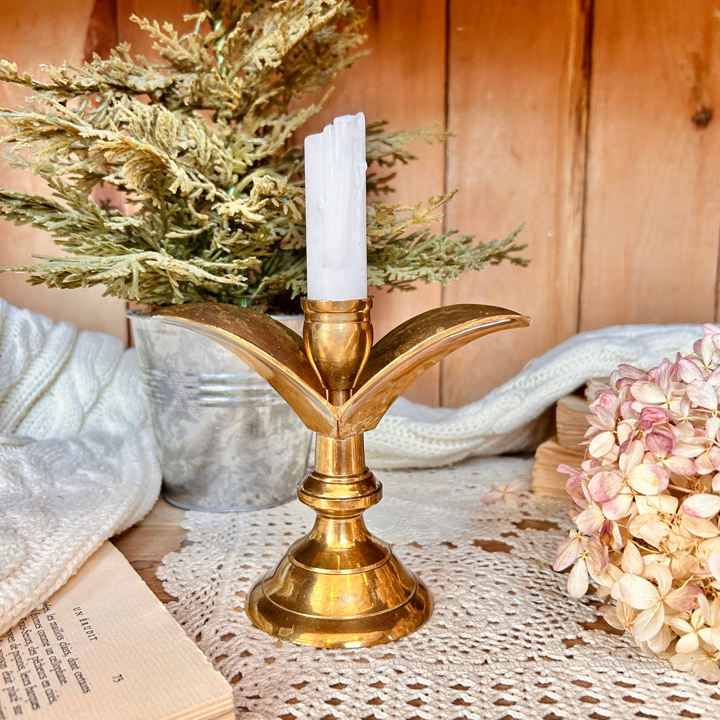 Ce bougeoir en laiton massif allie élégance et originalité, avec ses deux feuilles délicatement sculptées qui donnent l’impression d’une fleur en pleine éclosion. Parfait pour sublimer vos chandelles, il apporte une touche raffinée et naturelle à votre décoration intérieure.