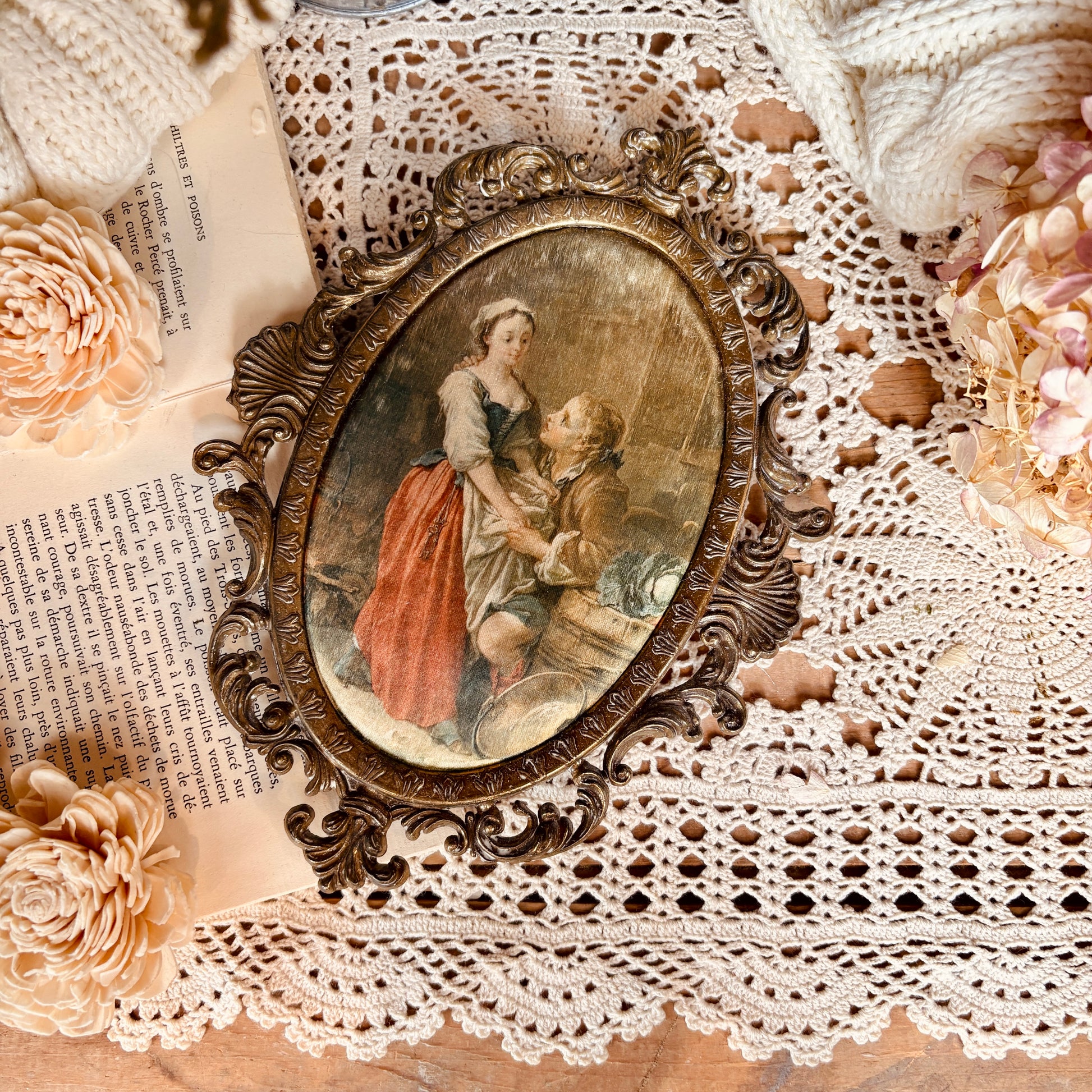 Cadre victorien en laiton orné, fabriqué en Italie avec savoir-faire artisanal. Encadrement élégant d'une impression sur soie, alliant finesse des détails et qualité des matériaux. Les ornements en laiton patiné soulignent la délicatesse de l'œuvre, créant une pièce intemporelle idéale pour les intérieurs classiques et raffinés.