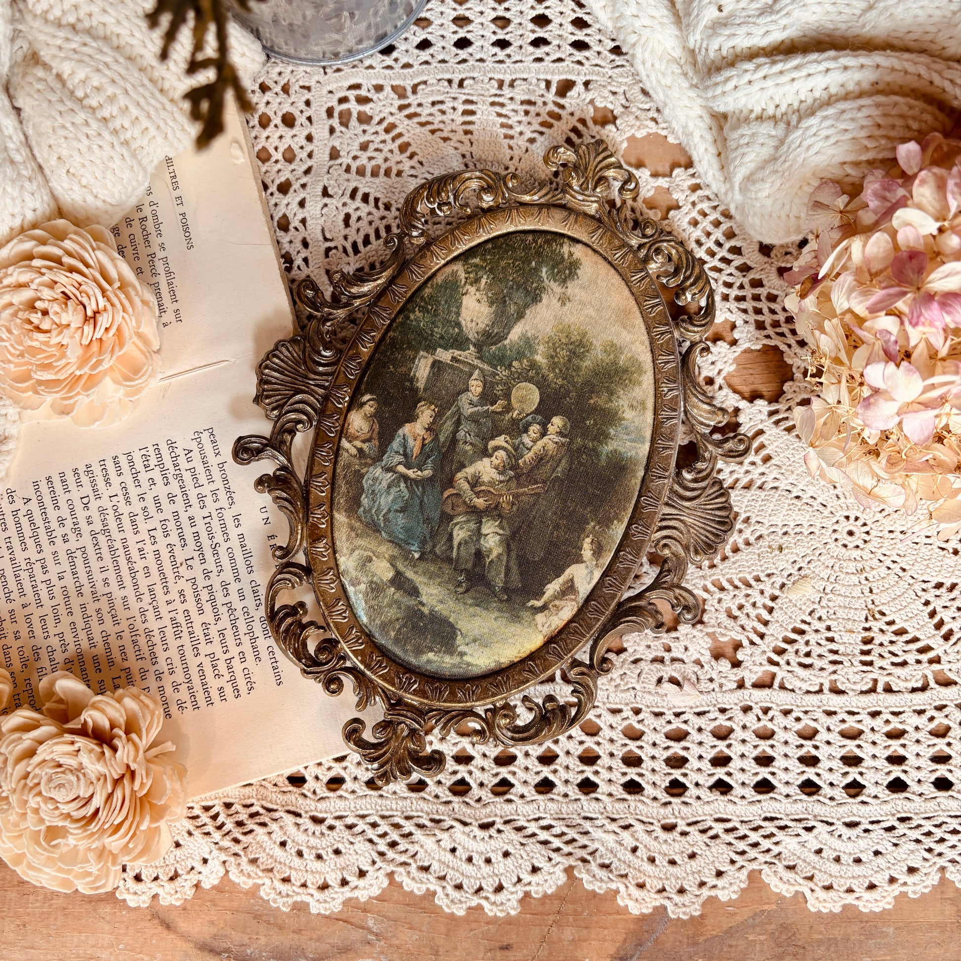 Cadre victorien en laiton orné, fabriqué en Italie avec savoir-faire artisanal. Encadrement élégant d'une impression sur soie représentant Le Troubadour, alliant finesse des détails et qualité des matériaux. Les ornements en laiton patiné soulignent la délicatesse de l'œuvre, créant une pièce intemporelle idéale pour les intérieurs classiques et raffinés.