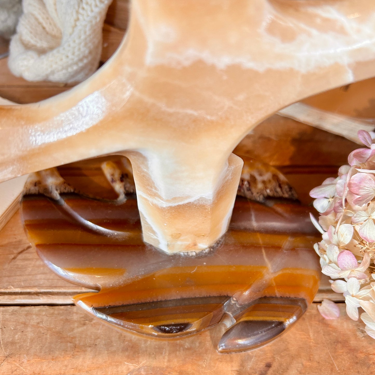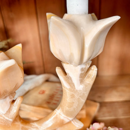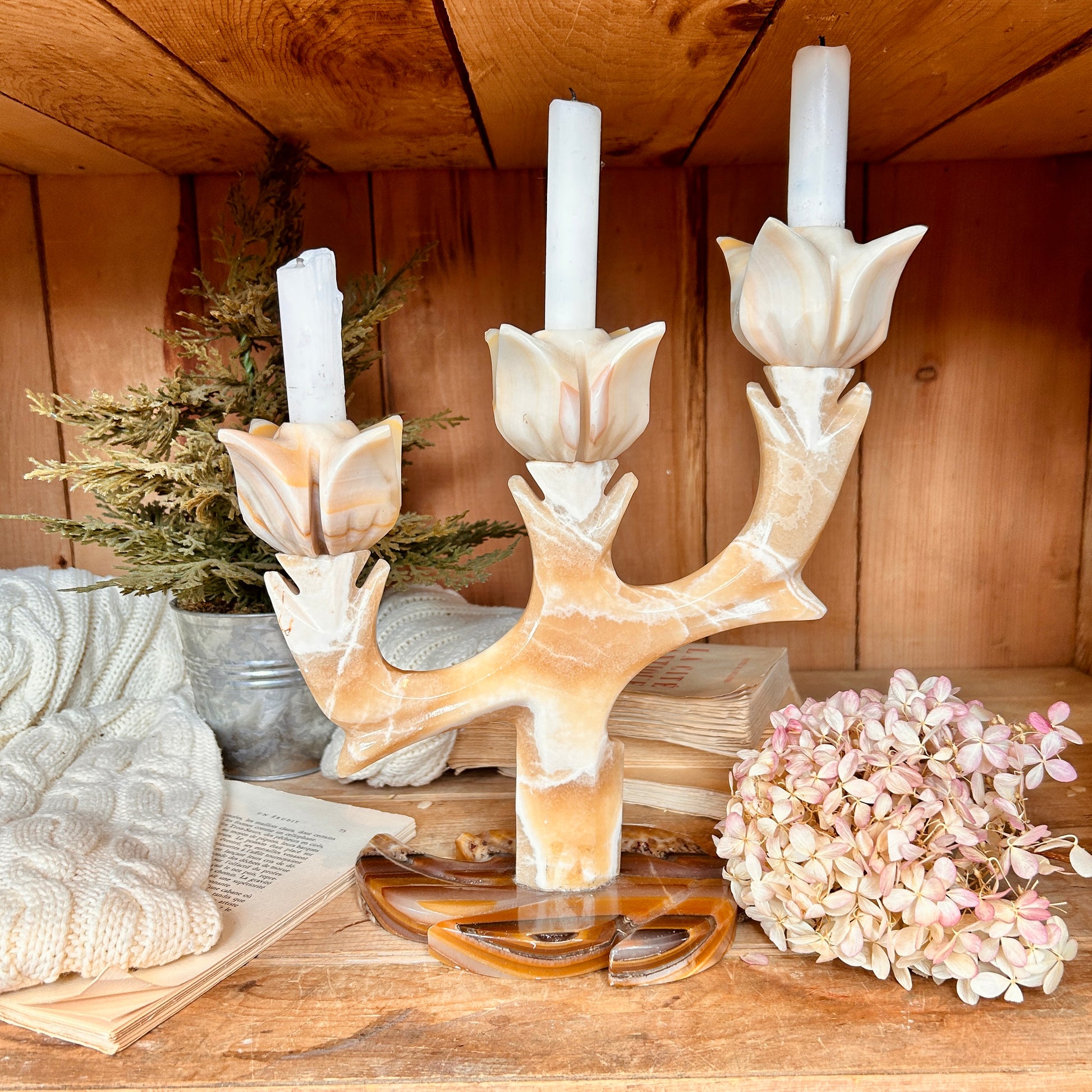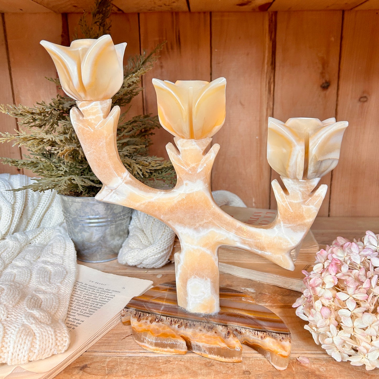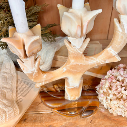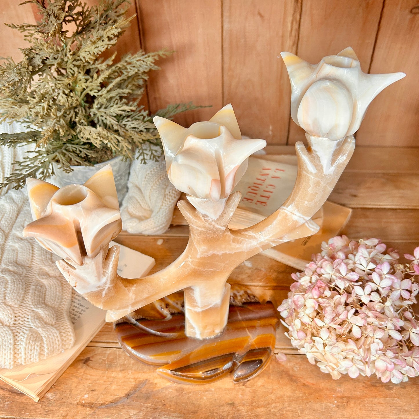 Sculptée avec précision dans l'onyx luxueux, cette pièce florale transforme l'art de l'éclairage en expérience sensorielle. Le candélabre capture délicatement la lumière des bougies, créant un jeu d'ombres et de reflets sur sa surface polie. Un accent décoratif intemporel qui élève instantanément l'ambiance de votre intérieur.