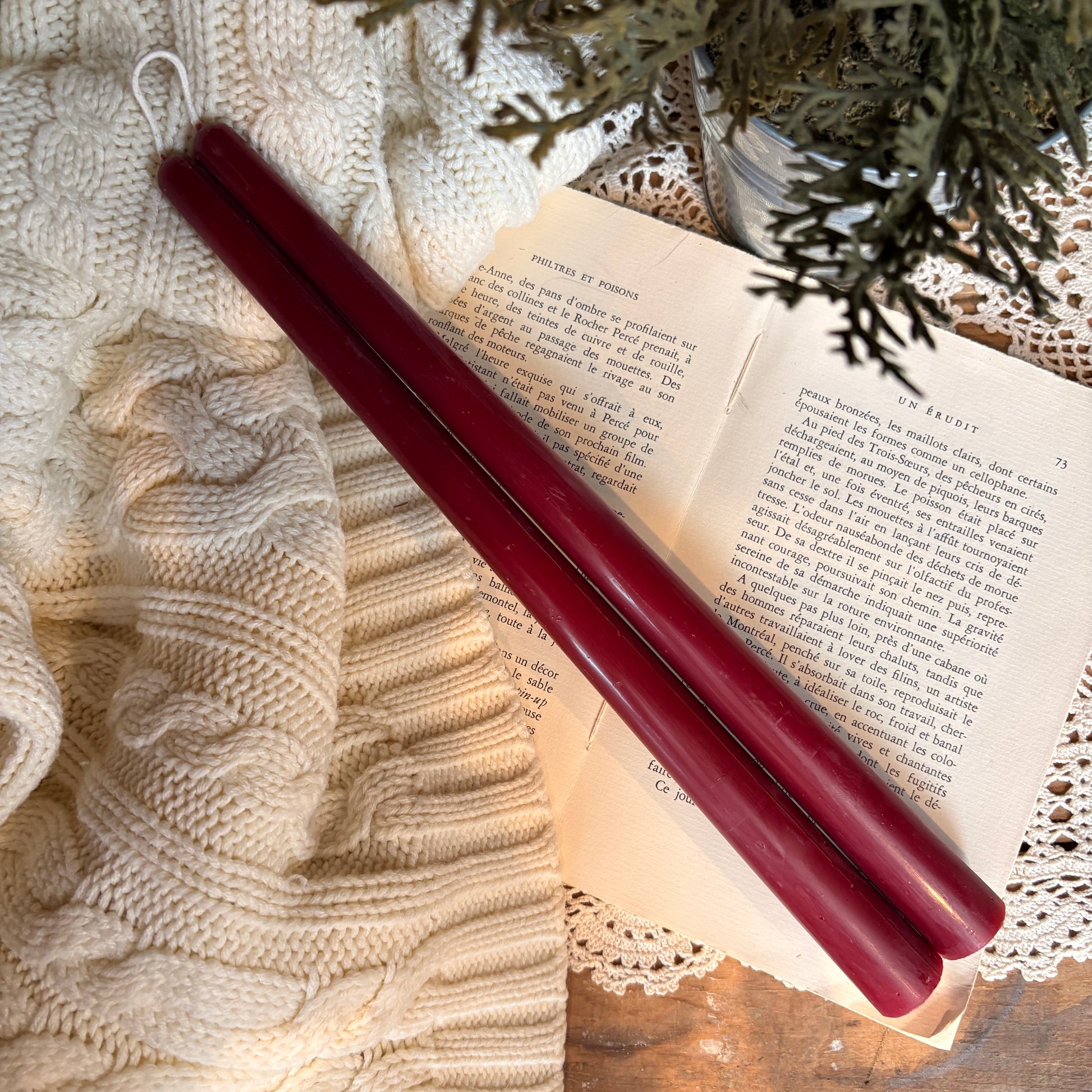 Ensemble de deux bougies de 12 pouces de couleur bourgogne. Simple et pure, la bougie conique en cire d'abeille 100 % naturelle de Honey Candles® est un incontournable de la table du dîner et un merveilleux ajout à toute occasion romantique.