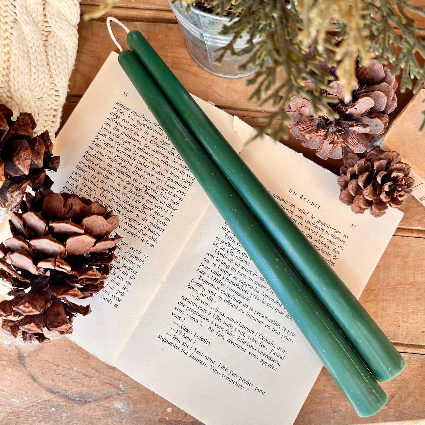 Ensemble de deux bougies de 12 pouces de couleur vert forêt. Simple et pure, la bougie conique en cire d'abeille 100 % naturelle de Honey Candles® est un incontournable de la table du dîner et un merveilleux ajout à toute occasion romantique.
