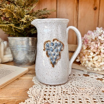 Découvrez le magnifique pichet artisanal en grès avec des motifs de raisin. Son design unique et imparfaitement parfait en fait un véritable objet d'art pour votre maison. Fait à la main par Pauline, ce pichet ajoute une touche de sophistication et d'exclusivité à vos repas et à votre décoration.