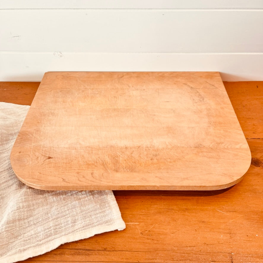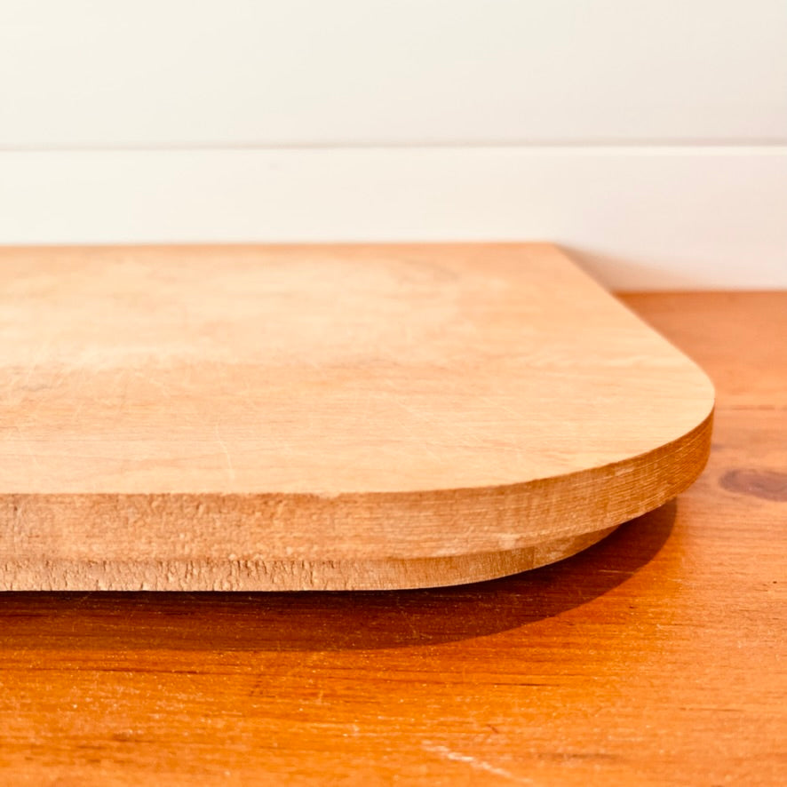 Jolie planche à découper en bois. Sa forme est très pratique pour adosser au mur.